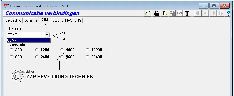 11. Selecteer bij het tabje COM de juiste com-poort van je USB (COM converter)